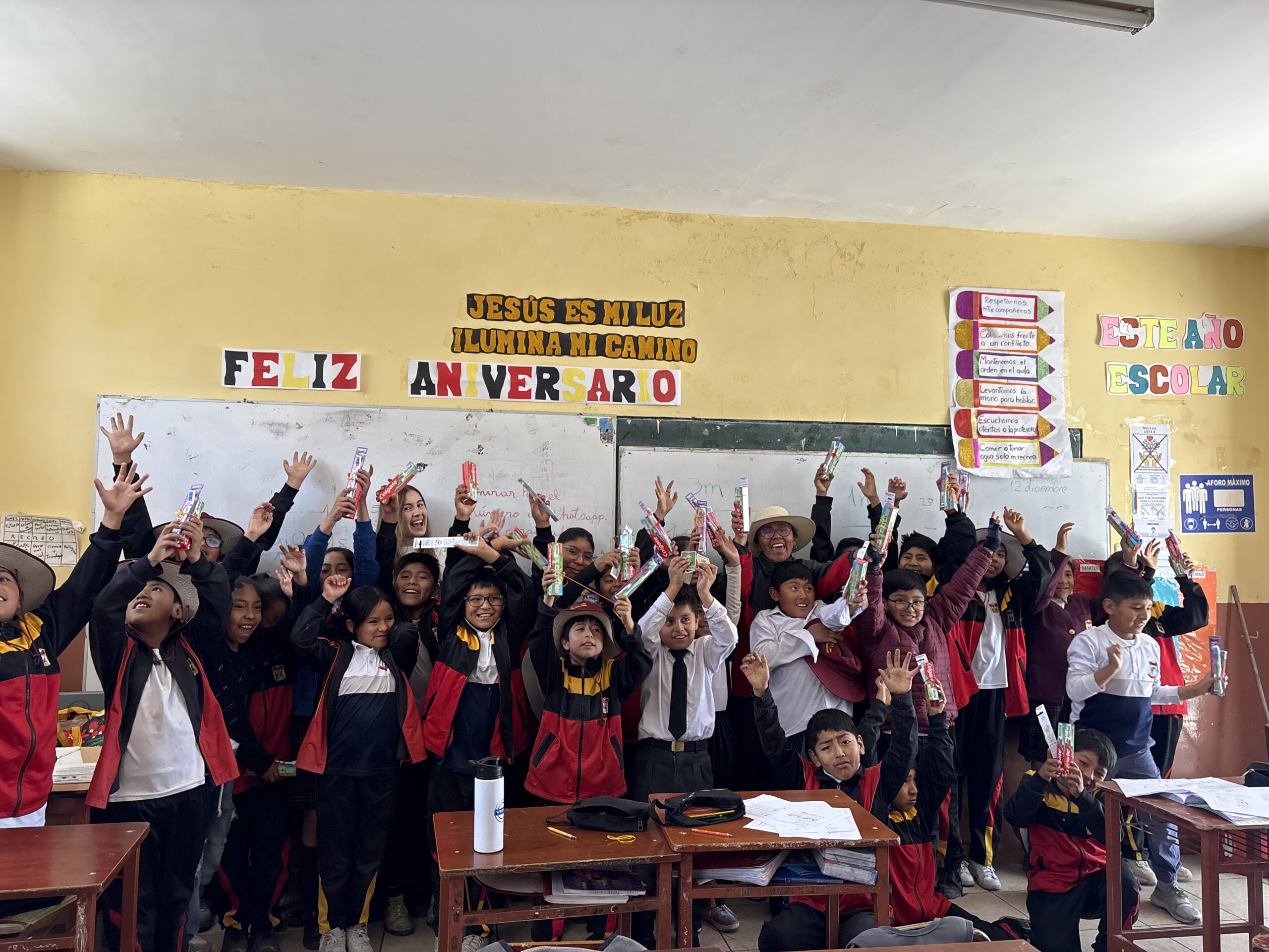 Daraufhin konnten wir in jede Klasse gehen und jedem Kind jeweils eine Zahnbürste und eine Zahnpasta geben.