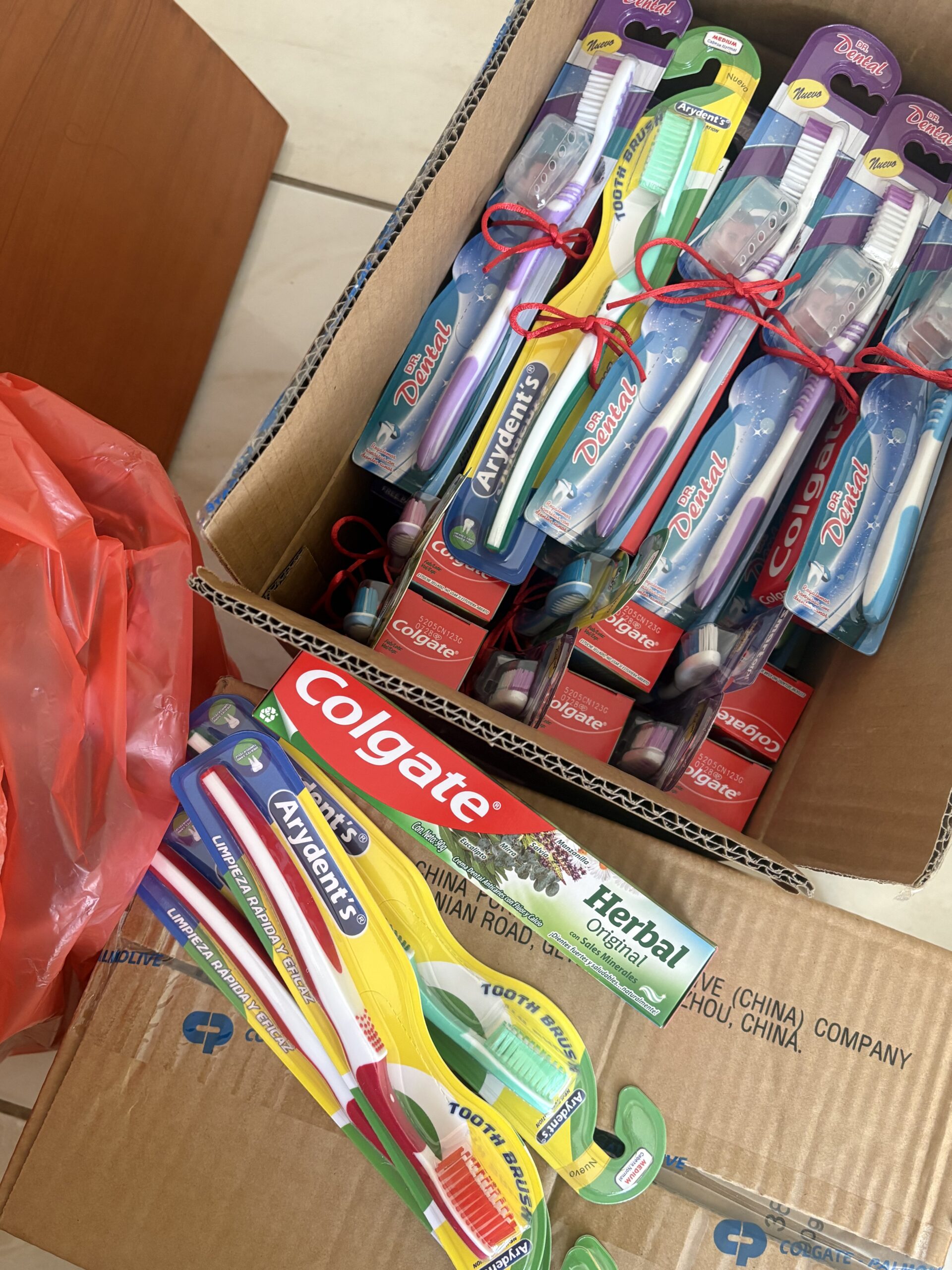 Gemeinsam mit Omar, dem stellvertretenden Schulleiter, haben wir insgesamt 500 Zahnbürsten und 500 Zahnpasten besorgt. Zu Hause haben wir diese anschließend ein Wochenende lang zu kleinen Päckchen zusammengestellt.